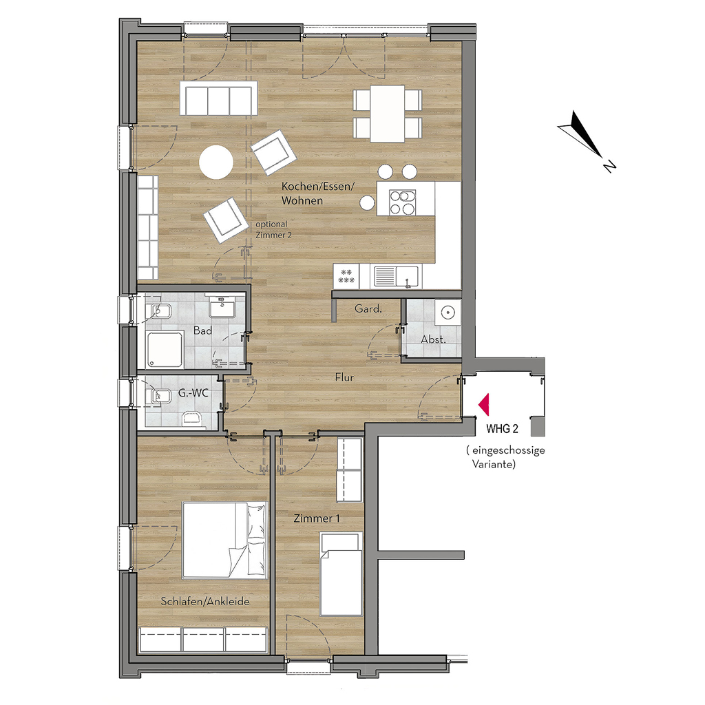 Ergänzt durch Bad, Gäste-WC erhalten Sie ein Wohnkonzept, das Ihnen individuellen Gestaltungsspielraum lässt.