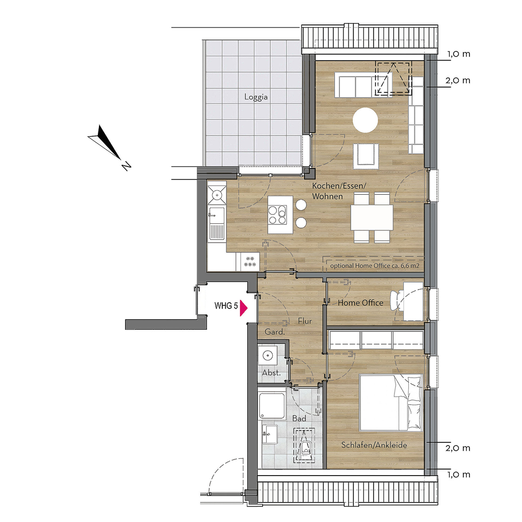 In dieser geschickt organisierten 2½-Zimmer-Wohnung mit ca. 65 m² wohnen Sie mit dem offenen Wohn-/Ess-/Kochbereich zur sonnigen Südwest-Loggia – ideal für Abendlicht und Weitblick.
